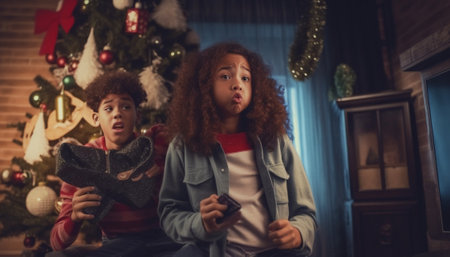 Generative AI : Side view of cheerful ethnic woman with gift playing with delighted boy with deer antlers while sitting on sofa near Christmas tree at home