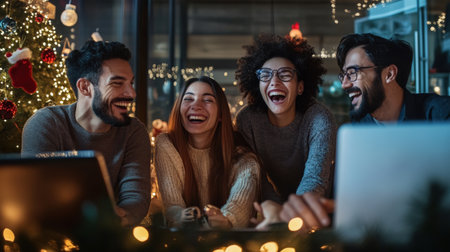 A close-up A team of employees enjoying a virtual Christmas celebration, with festive backgrounds and holiday cheer