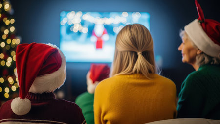 A family enjoys a cozy Christmas evening, watching movies on television while wearing Santa hats, surrounded by festive decorations.