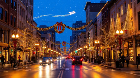 Bustling street with festive lights and holiday ambiance.