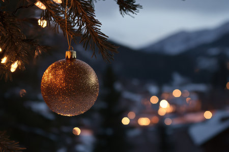 A golden ornament glimmers on a pine branch, illuminated by soft lights against a snowy mountain backdrop during the holiday season.