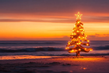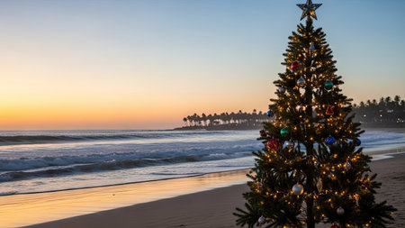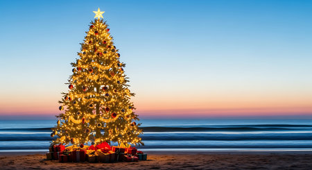 A beautifully decorated Christmas tree stands proudly on a sandy beach as the sun sets. The tree is adorned with twinkling lights and ornaments, casting a warm glow against the tranquil ocean backdrop.
