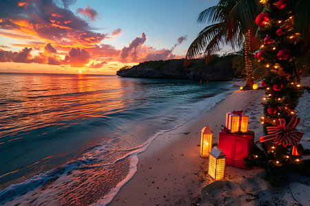 Tropical christmas tree adorned with poinsettias and ornaments on a serene ocean beach at dawn