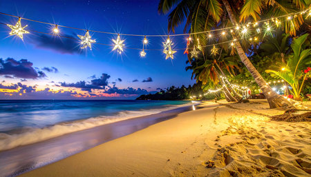 Beautiful tropical beach with christmas lights at sunset in Seychelles