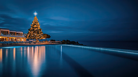 A stunning Christmas tree adorned with lights stands by a tranquil ocean, reflecting beautifully on the water, creating a serene holiday atmosphere.