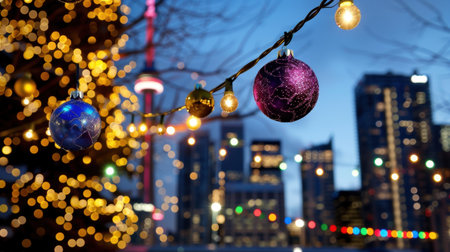 Colorful Christmas ornaments hang against the backdrop of a city skyline adorned with shimmering lights, capturing the essence of the festive season.