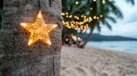 Glowing star decoration on tropical beach at night
