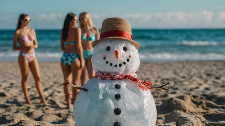 A whimsical snowman made of melting snow stands on a sandy beach during a warm sunset. Dressed with a classic black top hat adorned with festive decorations, it has stick arms, a carrot nose, and coal buttons and eyes. The ocean waves gently lap the shoreline in the background, creating a surreal blend of winter and summer scenery. This image symbolizes a unique and playful juxtaposition of seasons, perfect for capturing the imagination