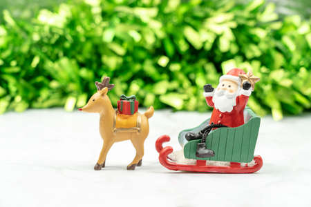 Santa sitting on sleigh with reindeer on blurred green background for create greeting card, Christmas and New Year Concept