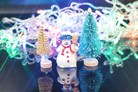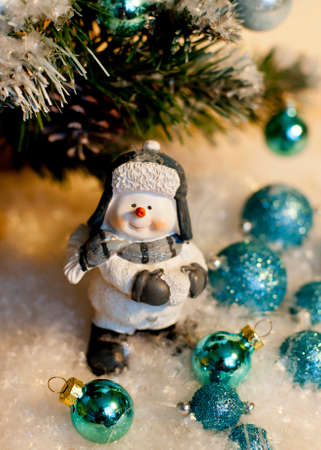 Christmas snowman under a Christmas tree. Toys, balls.