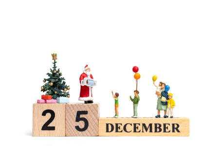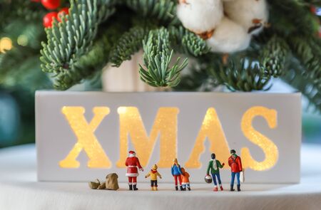 Christmas and Holiday Season Concept. Close of miniature figure people man woman child, kid family and Santa Claus standing in front of XMAS board and pine tree.