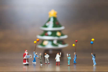 Miniature people: Santa Claus and childrens holding balloon with Christmas Tree. Merry Christmas and Happy New Year concept.