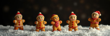 Gingerbread figures dressed for winter celebrations arranged in snowy setting for festive holiday spirit
