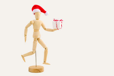 Running Wooden figure - art mannequin with red Santa hat with gift box on white background. Business and design concept for Christmas