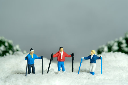 Miniature people toy figure photography. Winter sport. Group of snow climber gathering on meeting point in the snowy mountain.