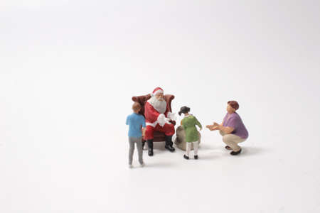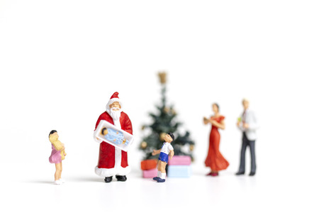 Miniature people : Santa Claus holding gift for happy family