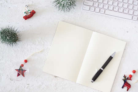 Merry Christmas and Happy new years office work space desktop concept. Flat lay top view with keyboard, blank notebook and Christmas ornaments with copy space.