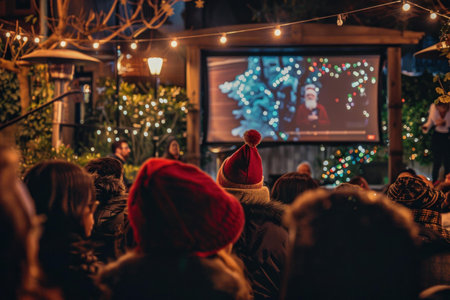 People gather outdoors wearing warm hats to watch a christmas movie under string lights