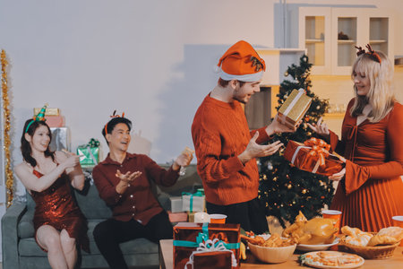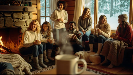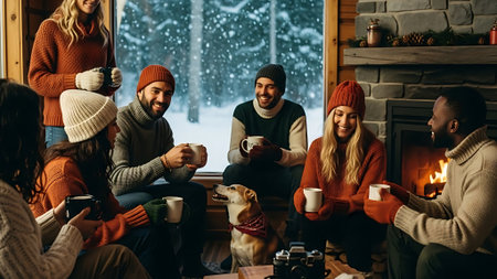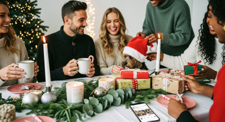 A festive gathering with friends celebrating christmas, enjoying hot drinks, surrounded by gifts and decorations