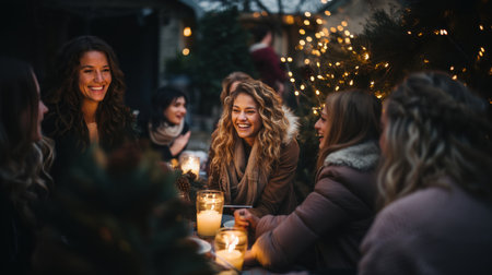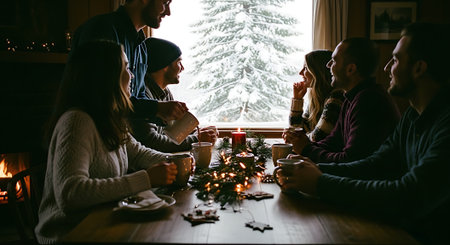 A group of friends enjoying hot drinks and snacks around a festive table, decorated for the holidays, with a cozy atmosphere