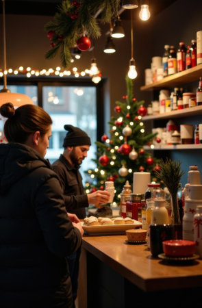 Two baristas working behind the counter in a cozy coffee shop, preparing hot beverages and pastries amidst festive decorations and a beautifully adorned christmas tree