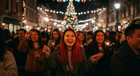 Multi-ethnic young people celebrating New year eve holding sparklers