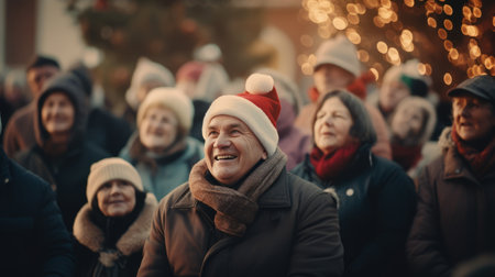 A lively crowd celebrating the holiday season, with a focus on a person in a Santa hat standing in front of a radiant Christmas tree.High resolution AI generated