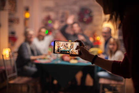 Girl using smartphone to take photos of her family for christmas celebration.