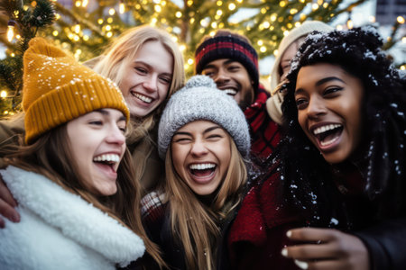 A cheerful group of diverse friends taking a selfie at a Christmas market, filled with twinkling lights, perfect for illustrating holiday joy and togetherness.