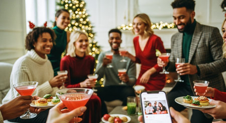 A festive gathering with friends celebrating the holidays, holding cocktails and enjoying appetizers, decorated Christmas tree in the background