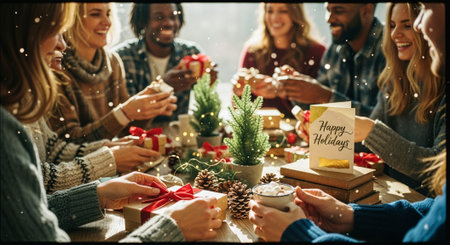 A group of friends celebrating the holidays around a table filled with gifts, decorations, and festive items, with warm lighting and a cozy atmosphere