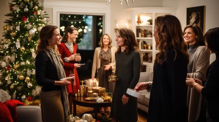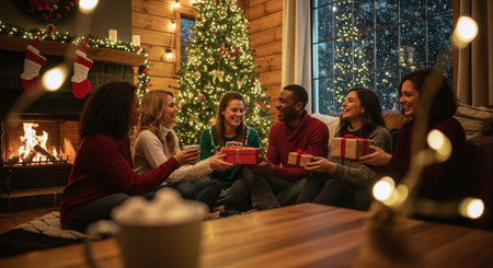 A cozy holiday gathering with friends around a decorated Christmas tree, exchanging gifts and enjoying warm drinks by the fireplace