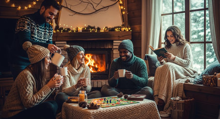 A cozy indoor gathering with friends playing board games by a fireplace, wearing warm sweaters and hats, with mugs in hand and a festive atmosphere