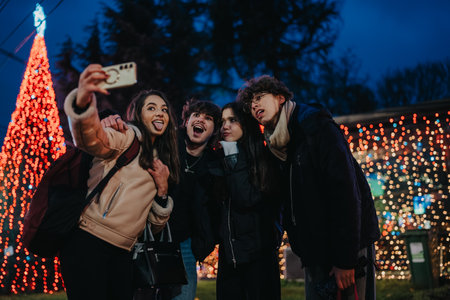 Teenage friends take a selfie at a festive Christmas light display during evening