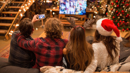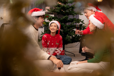 A joyful group of friends celebrating Christmas in a cozy living room, with a decorated tree, festive lights, and a warm fireplace