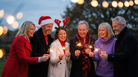 A happy group of six mature friends celebrating Christmas or New Years Eve outdoors at dusk. They are smiling, holding lit sparklers and glasses of champagne with festive lights in the background.
