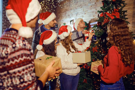Friends decorate the Christmas tree at home at Christmas.