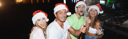 Panoramic orientation of young friends opening bottle of champagne while celebrating new year near near swimming pool at night