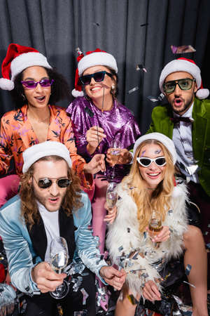 young adult interracial friends in santa hats and sunglasses having party on gray background