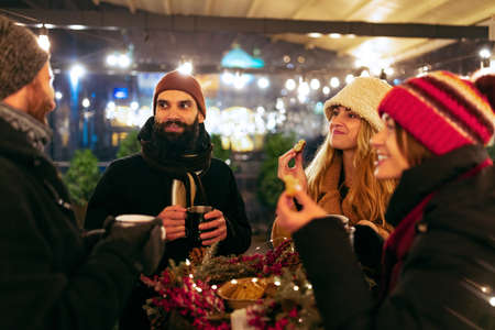 A happy group of people standing at a Christmas market, Christmas party, Friends Having fun together at a Christmas fairy. Cheerful people having a walk, dressed warm, Enjoying Christmas Market