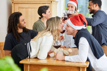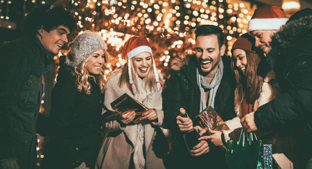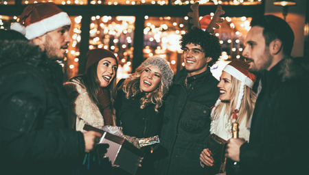 Happy smiling friends enjoy christmas time.