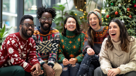 Friends wearing ugly Christmas sweaters share laughter and joy as they dance around a Christmas tree adorned with colorful decorations and lights