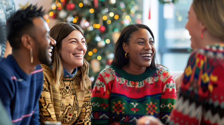 A cozy holiday gathering with friends, sitting around a beautifully decorated Christmas tree, exchanging gifts, warm fireplace in the background