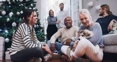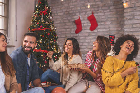 Group of young friends sitting by nicely decorated Christmas tree, celebrating Christmas at home, having fun while exchanging and opening presents