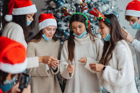 Group of young people celebrating Christmas at home, standing near christmas tree