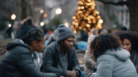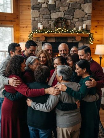 Laughter and warmth fill the living room as a multiethnic family gathers around during Christmas surrounded by festive decorations and a glowing tree.