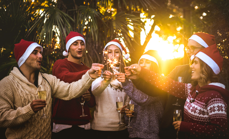Friends group with santa hats celebrating Christmas with champagne wine toast outdoors - Tropical holidays concept with young people enjoying time and having fun together with sparkles at sunset