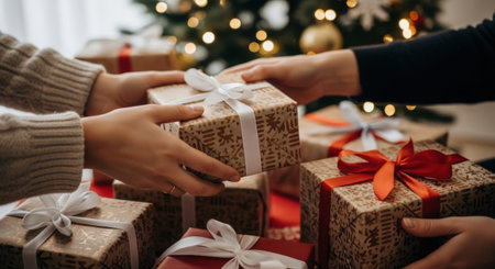 Close-up showing beautifully wrapped gifts on a wooden surface, beneath the soft glow of holiday lights and a decorated tree. It captures the joy and anticipation of gift-giving and the festive spirit of the winter season.
