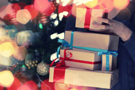 Close-up of female hands holding gift boxes in front of Christmas tree
