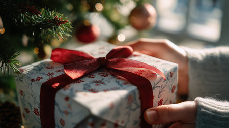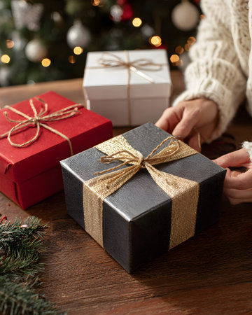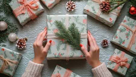 Hands tying red ribbon on Christmas gift with festive wrapping and holiday ornaments on wooden table, surrounded by pine branches in cozy seasonal atmosphere.